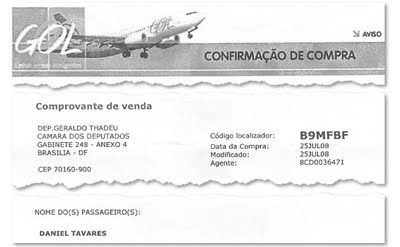 Cópia de uma passagem emitida pelo deputado Geraldo Thadeu em nome de