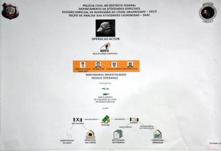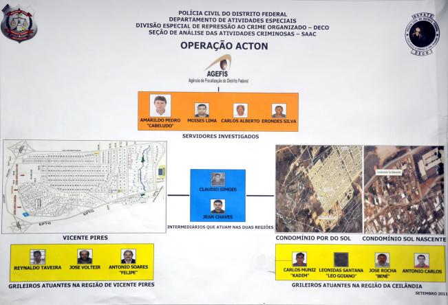 O trabalho dos policiais e dos promotores do Núcleo de Combate ao Crime Organizado (NCOC) do Ministério Público desvendou uma quadrilha especializada em cobrar propinas para evitar derrubadas de construções irregulares e para fazer vista grossa diante de parcelamentos irregulares do solo e invasões de áreas públicas. Os valores variavam de R$ 5 mil a R$ 10 mil, dependendo do imóvel. A atuação do grupo ocorria, principalmente,em Vicente Pires e condomínios da Ceilândia, como Pôr do Sol e Sol Nascente. A Polícia Civil suspeita que o grupo atuava há cerca de um ano.