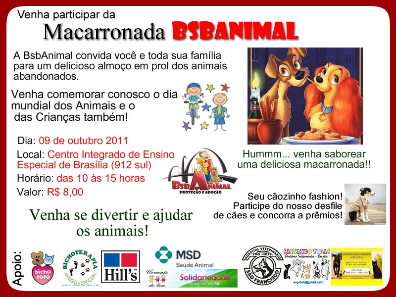 A associação BsbAnimal, que cuida e encaminha para adoção animais vítimas de maus tratos, convida você e sua família a participar de mais uma edição da nossa deliciosa Macarronada Animal!