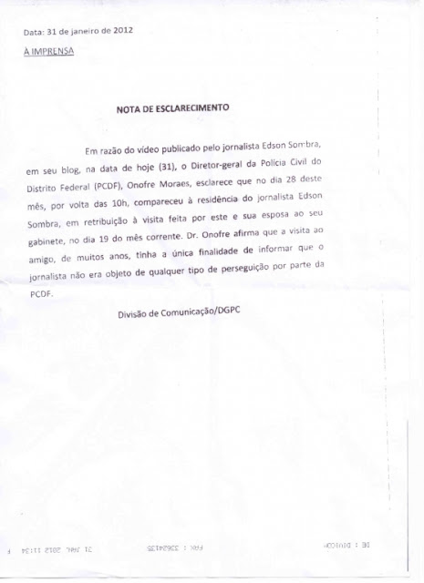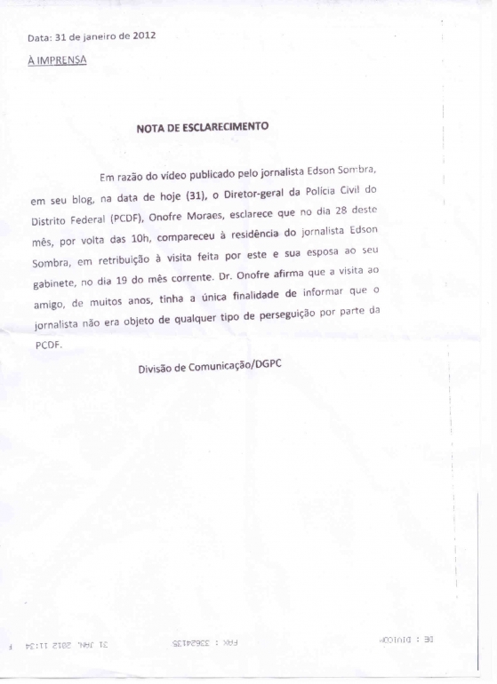 A informação, no entanto, é desmentida pelo diretor-geral em nota enviada à imprensa nesta tarde (31). Sombra divulgou em seu blog as imagens de uma visita de Onofre à sua casa por volta das 10h de sábado (28). Na nota, o diretor afirma que procurou pelo “amigo” para agradecer a visita feita no dia 19 de janeiro, na delegacia, e informá-lo que não é “objeto de perseguição por parte da Polícia Civil do Distrito Federal”. Ou seja, Moraes desmente a entrevista. As imagens não mostram se Onofre chegou a ser recebido na casa do jornalista.